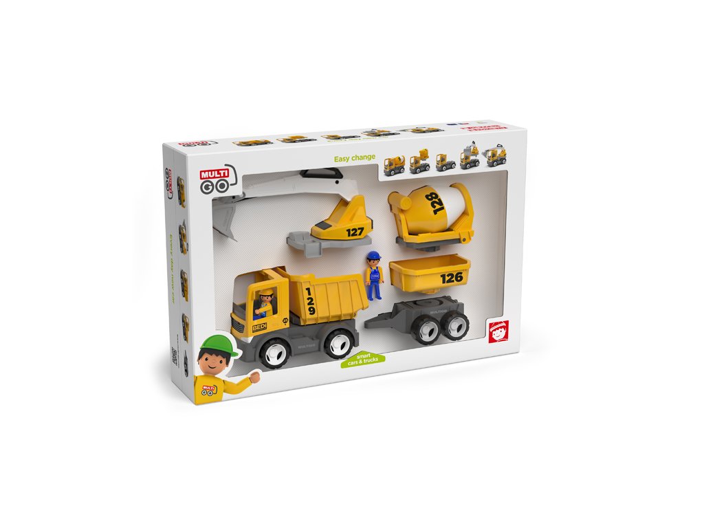 Sada obsahuje jedno auto, 2 Igráčky stavbaře a 4 korbičky: